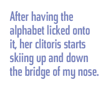 As a bipolar manic depressive, I carry around a weird mixture of hubristic entitlement and wretched guilt. It’s as if I own the whole planet, only none of the air is mine and I keep stealing it by the lungful. My favorite way out — or deeper in, depending on how you see it — is cunnilingus. When I go down on a woman, and she’s coming, I’m glowing with quiet glee; having involved my whole face, I’m in there all the way, stealing air by the lungful. Despite the physical constraint, I find this so weirdly liberating. I’m starting to think it has something to do with my ambivalence about being a man.